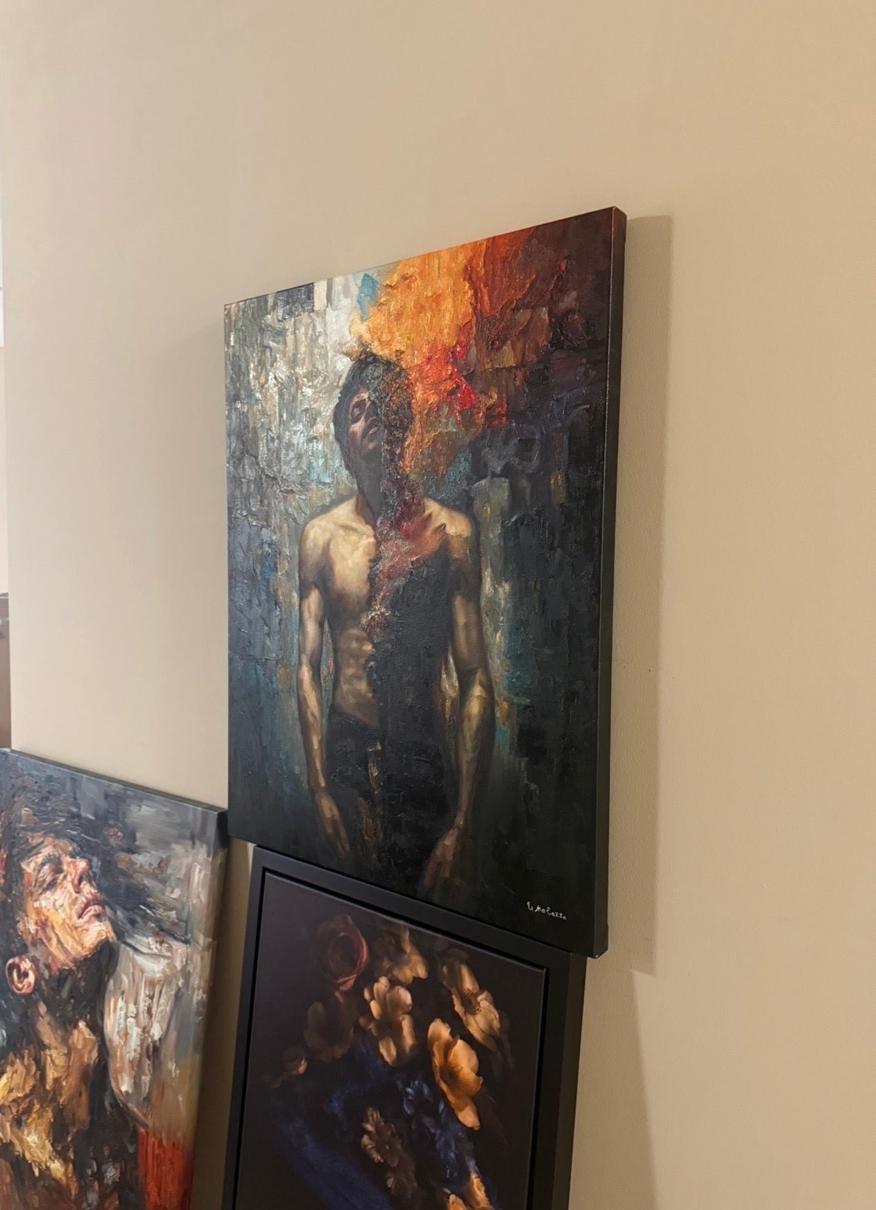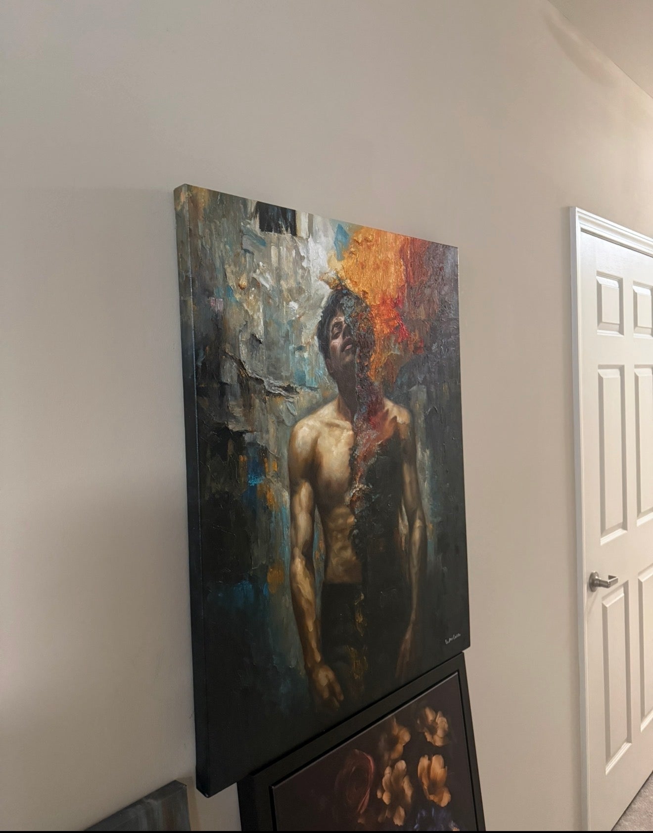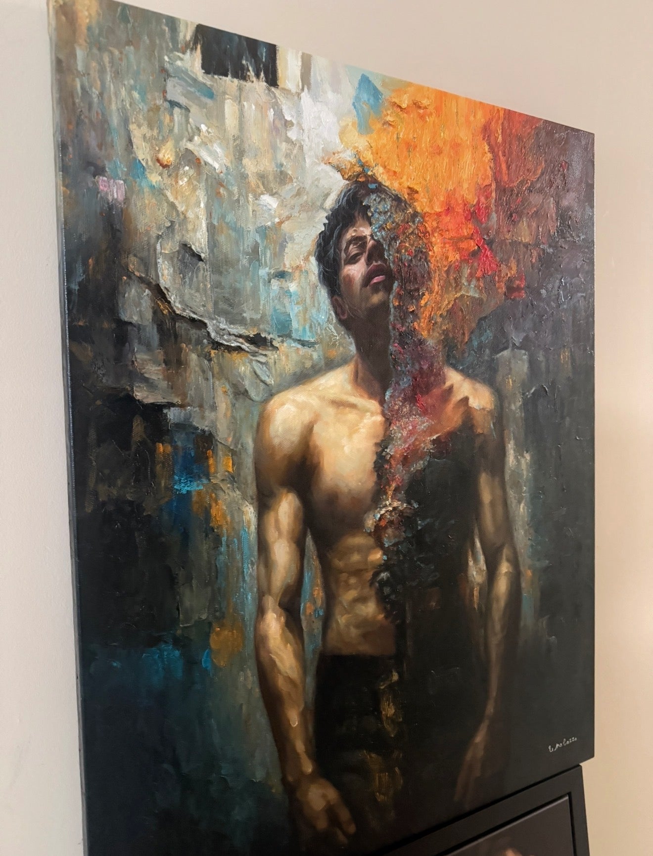 One half of the figure remains illuminated in warm flesh tones, modeled with careful realism. The other half fractures into a cascade of fire, mineral texture, and shadow. The surface is not smooth. The flame is layered in pigment and mass, built with weight and intention. What appears to consume the figure is physically constructed from paint itself.