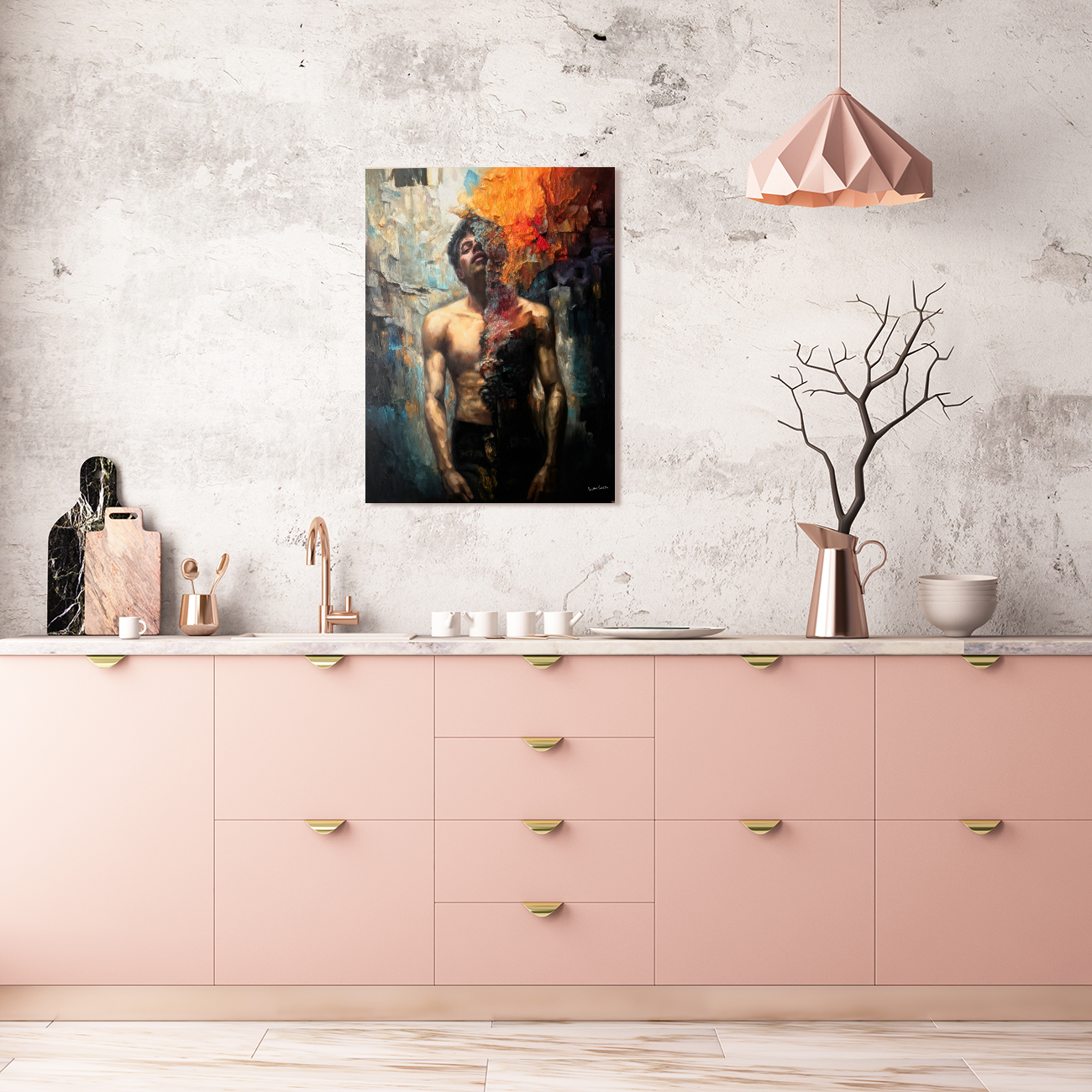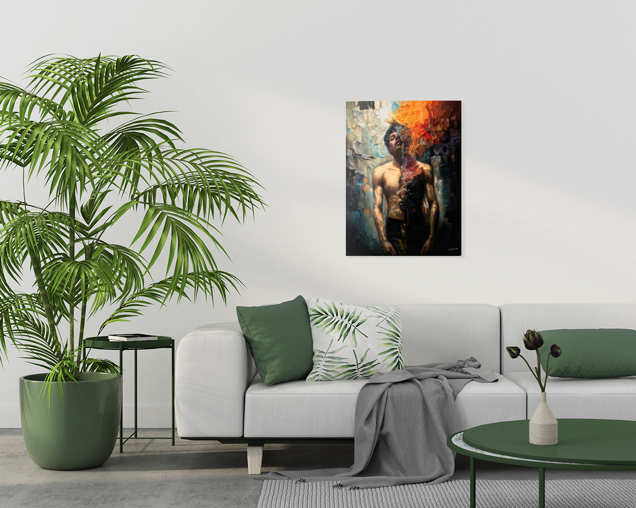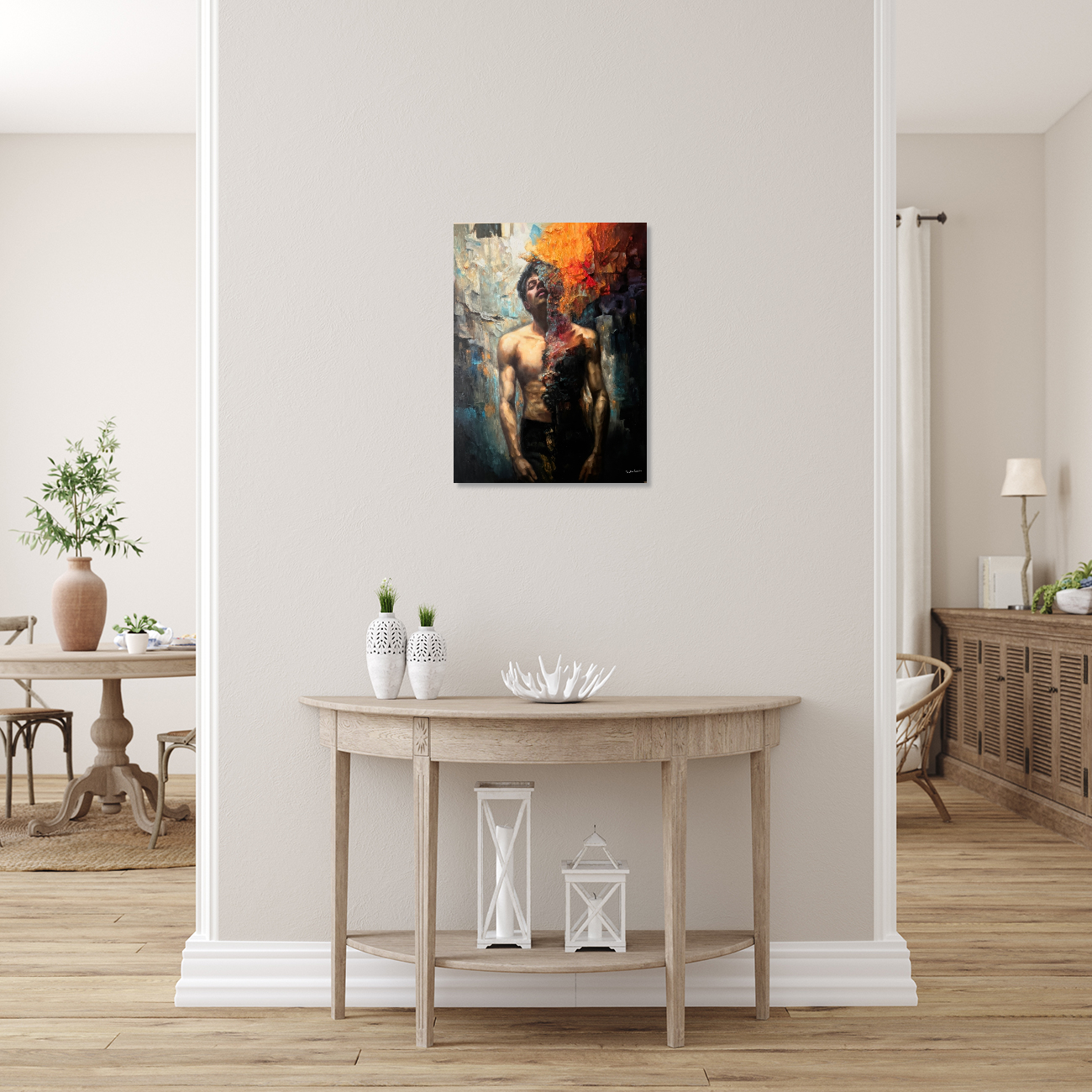 One half of the figure remains illuminated in warm flesh tones, modeled with careful realism. The other half fractures into a cascade of fire, mineral texture, and shadow. The surface is not smooth. The flame is layered in pigment and mass, built with weight and intention. What appears to consume the figure is physically constructed from paint itself.